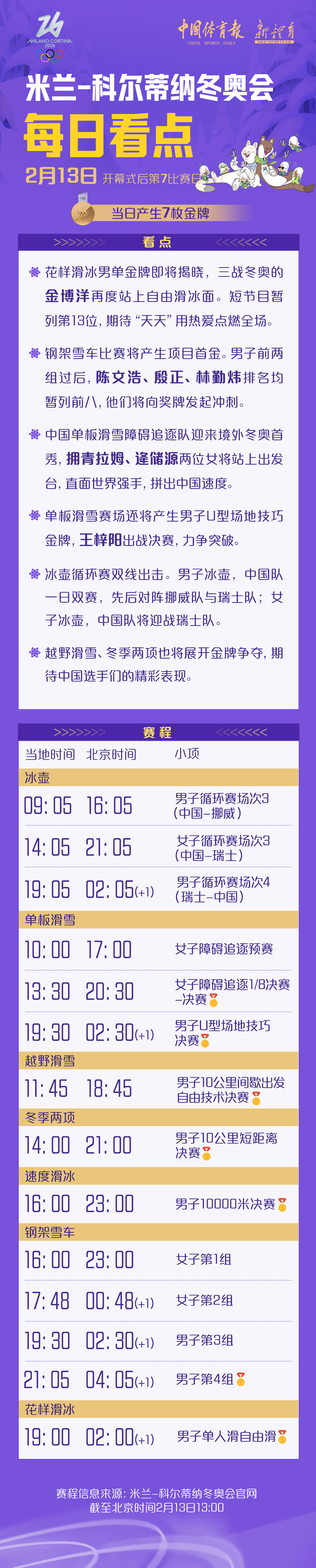 冰壶循环赛双线出击。男子冰壶,中国队一日双赛,先后对阵挪威队与瑞士队;女子冰壶,中国队将迎战瑞士队。