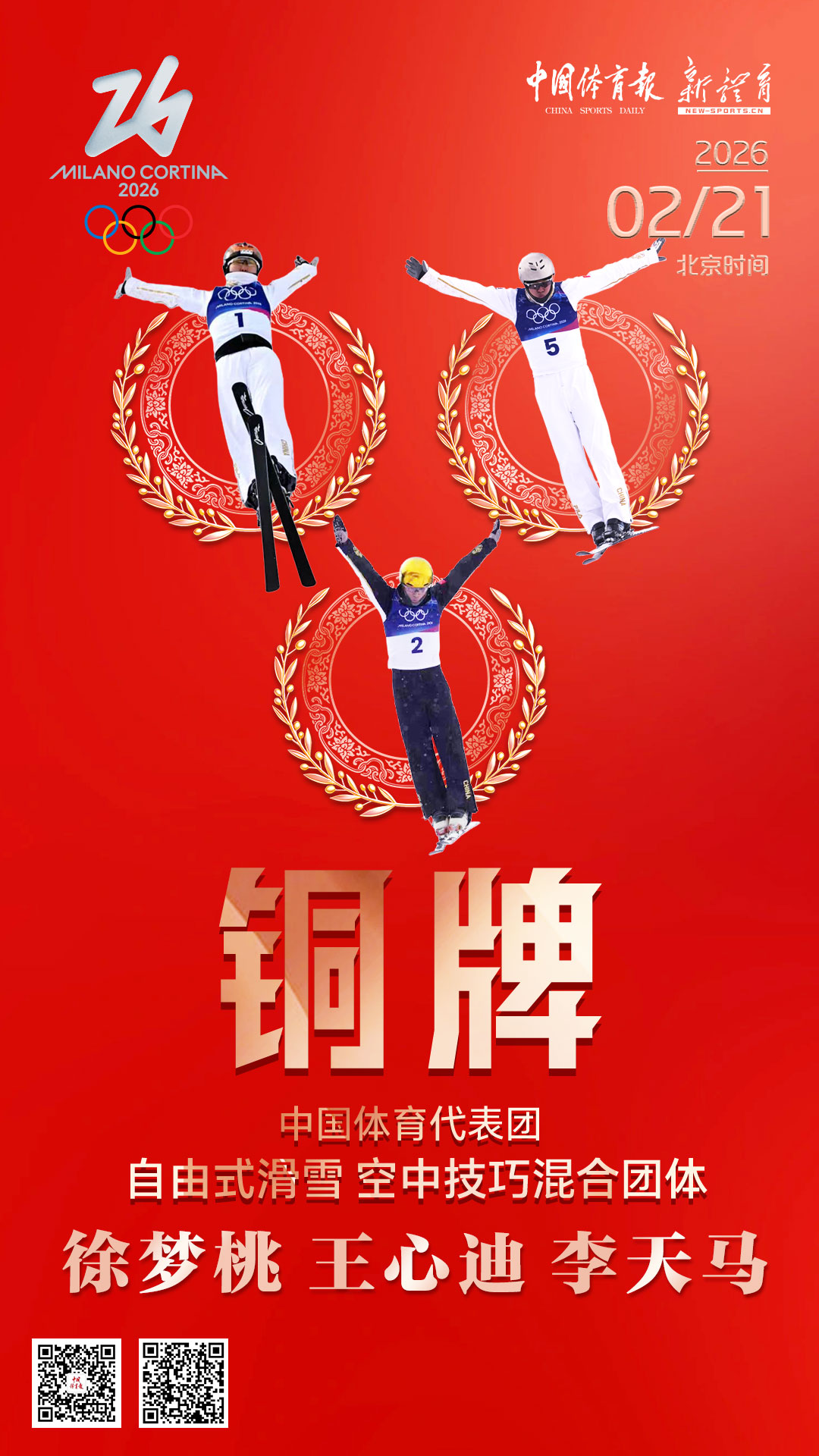 当地时间2月21日上午进行的米兰·科尔蒂纳冬奥会自由式滑雪空中技巧混合团体比赛中,由徐梦桃、王心迪、李天马组成的中国队拼下一枚宝贵的铜牌。祝贺中国体育代表团!祝贺中国空中技巧队!