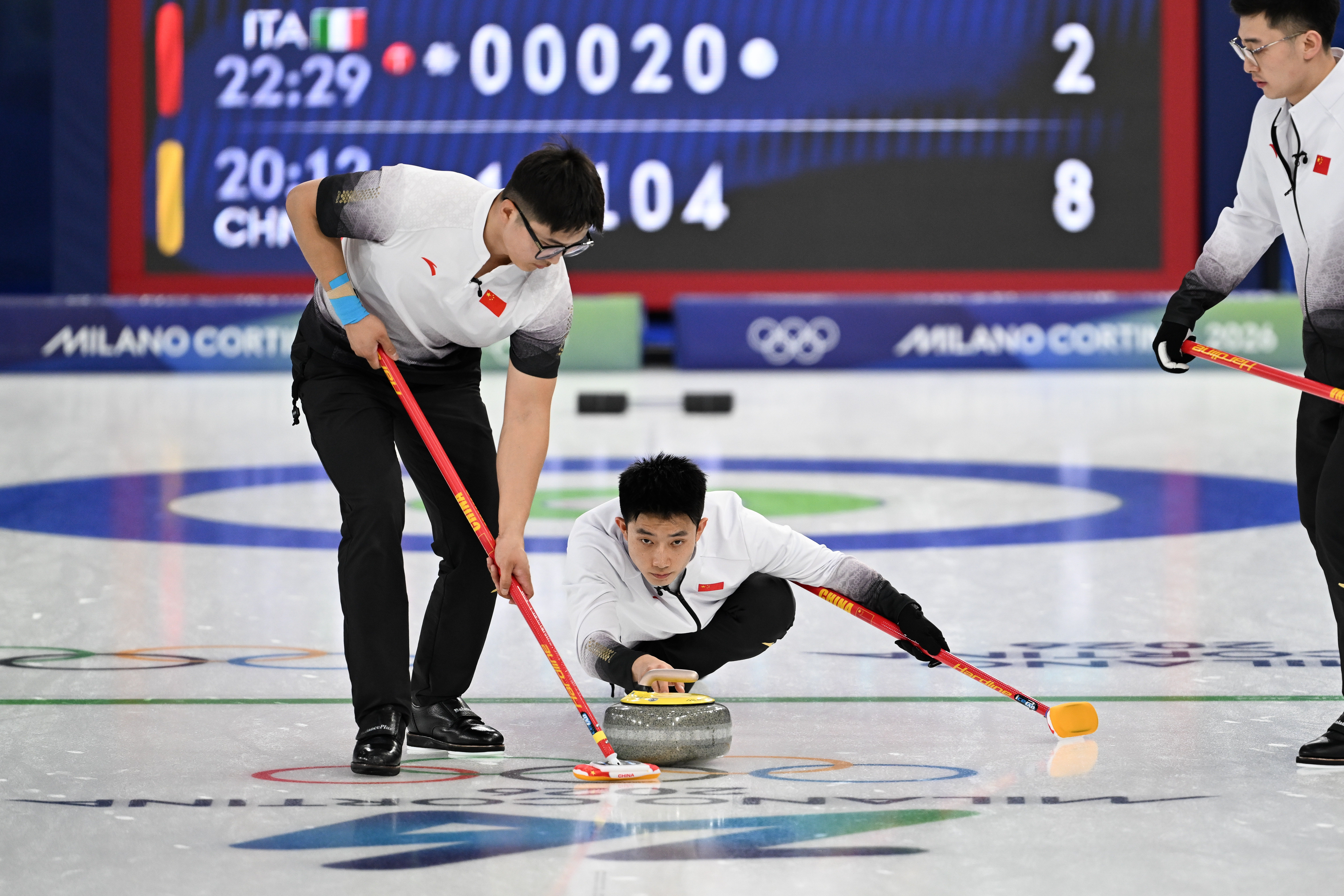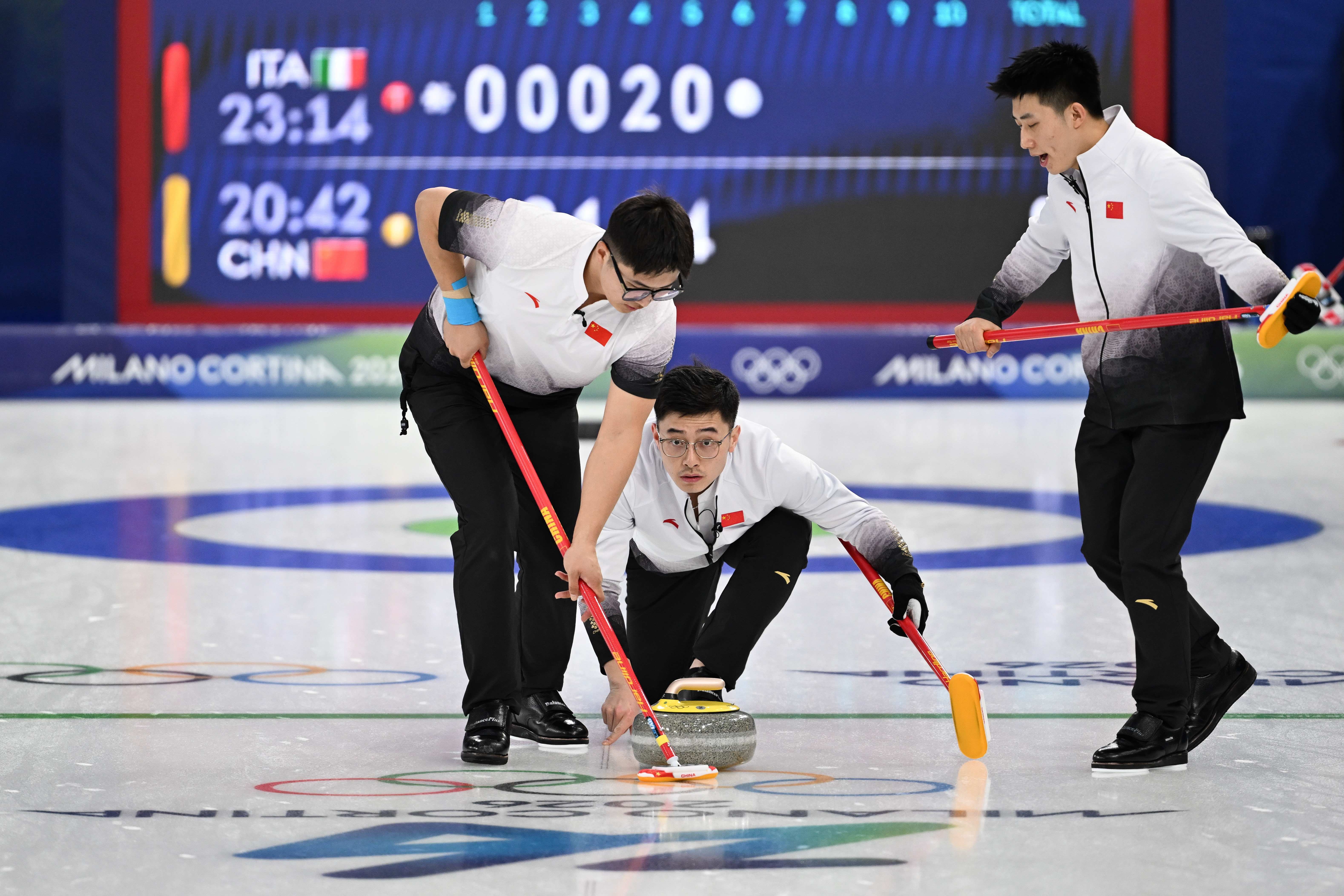 当地时间2月16日,米兰冬奥会男子冰壶循环赛继续进行,由四垒徐晓明、三垒费学清、二垒李智超、一垒许静韬组成的中国队以11比4大胜东道主意大利队。